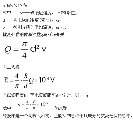 被測(cè)介質(zhì)垂直于磁力線方向流動(dòng),因而在與介質(zhì)流動(dòng)和磁力線方向都垂直的方向上產(chǎn)生一感應(yīng)電動(dòng)勢(shì)e。